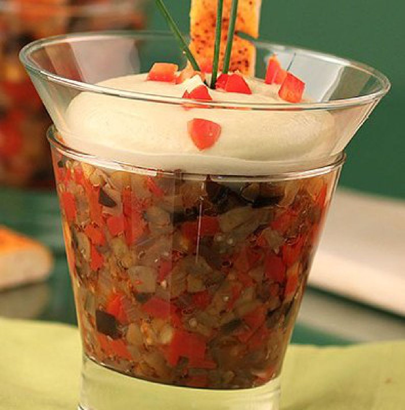 Cebolla, Calabacín, Berenjena, Pimentón y Tomate en porciones iguales. Entre 100 y 150 gramos por persona.